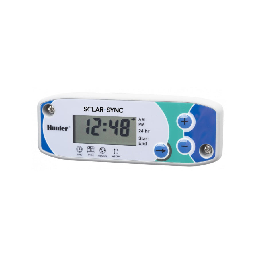 The Solar Sync Sensor is an advanced weather sensor that calculates evapotranspiration (ET) and adjusts Hunter controllers daily based upon onsite weather conditions. Solar Sync measures sunlight and temperature and uses ET to determine the correct seasonal adjustment percentage value to send to the controller. The controller then uses its programmed run time and adjusts to Solar Sync’s seasonal adjustment value to modify the actual irrigation run time for that day. In addition, the Solar Sync sensor integrates Hunter’s popular Rain-Click™ and Freeze-Clik® sensors providing quick response in shutting down your irrigation system during rain and/or freezing conditions. The Solar Sync is compatible with most Hunter controllers and applicable to residences, businesses, and municipalities alike.
