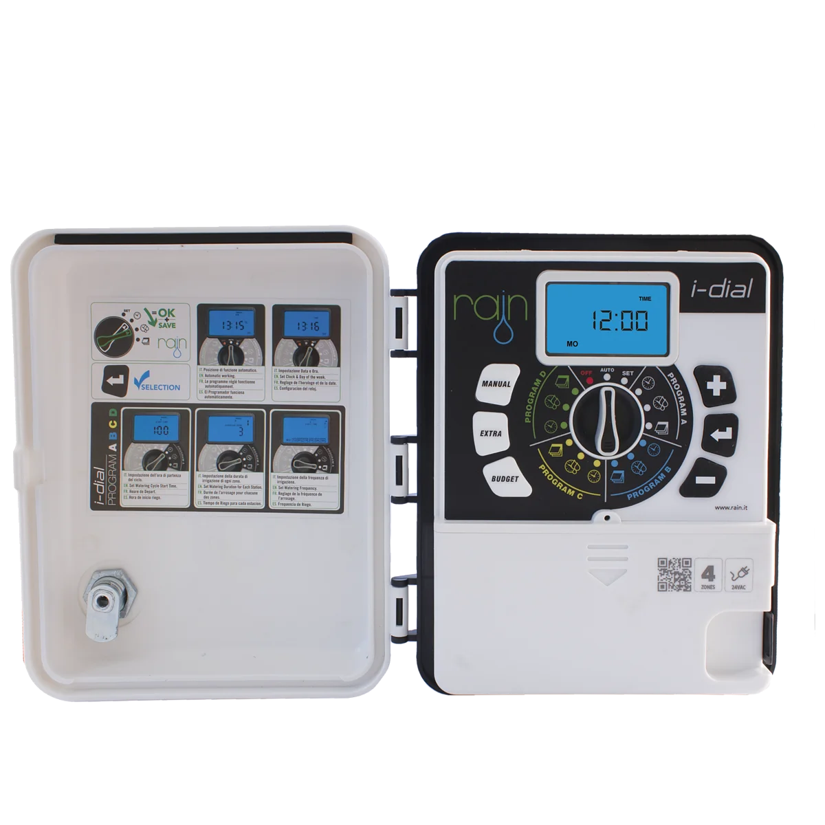 I-Dial Outdoor is a full-function control unit designed for flexible system management. Its versatility makes it ideal for residential as well as sports and municipal applications. It can control up to 12 solenoid valves with 4 programs and 1 start each. The easy 3 Easy Steps programming methodology allows you to change the programming in just 60 seconds. In addition, extra functions allow for management of the rain sensor and pump.