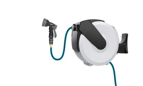 The 25m Retractable Hose Reel with included 8 function watering gun and double hose connector is the ideal solution for garden watering. The smooth pull and rewind action with automatic retraction and optional position lock virtually eliminates kinks and keeps the hose tidy and out of the way when not in use. With 25m of length and a 180° swivel action you'll get to every corner of your garden with ease. With a robust, UV treated PP cover, adjustable tension to optimise hose retraction and the ability to replace the hose the Wetta Retractable Hose Reel will give you years of trouble free use.